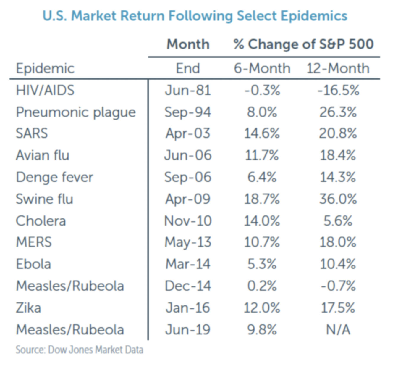 This isn’t the first outbreak that we have had. Over the past 20 years we have seen Sars, Avian Flu, and Zika just to name a few. The markets tend to have short-term memories and typically have been positive within six months to a year following a major outbreak as you can see in the table below.